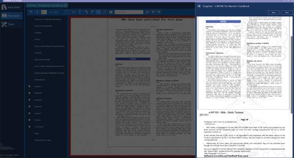 e-Reader Snap Shot 기능은 AENP 페이지와 해당되는 Notices to Mariners(NMs) 그리고 Passage Planning을 지원하기 위해 사용되는 부록을 보거나 저장하고 출력할 수 있도록 해줍니다.